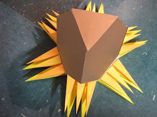 For the mask I used a polyhedral that I found on the website for the base of my structure and various size pyramids for the mane. I used warm, bright colors, yellows and oranges. My idea of the packaging came from a hand, with five fingers. Then I used a five sided pentagon, one for each nail polish. I used the colors of the polishes themselves for the decoration of the package.